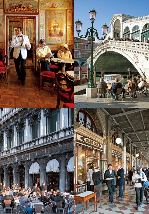 上左/カフェ・フローリアンのきらびやかな店内。©Anzenberger/amanaimages 上右/サン・マルコ広場からほど近いリアルト橋は1591年に再建されたもの。 下左/店の外に並ぶ席のそばに楽団のスペースがある。 下右/毎日大勢の観光客でにぎわうカフェ・フローリアン。これは広場に面した部分。