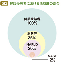 健康診断の受診者のうち、脂肪肝はおよそ35%いる。3人に1人以上の割合だ。さらに非アルコール性のNAFLDは20%で、NASHは2%とされている(図2)。診断は肝臓の組織検査、いわゆる肝生検(かんせいけん)が必要になる。