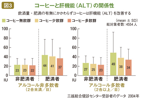 健康な成人4554人を「アルコールを飲む人・あまり飲まない人」「太っている人・太っていない人」「コーヒーを飲まない人・少し飲む人・たくさん飲む人」の12群に分けて肝機能をみた。すると、アルコールの量や肥満の有無にかかわらず、「コーヒーは肝機能を改善する」ことがわかった。(図3)