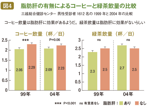つまり、肥満度は脂肪肝に関係していて、コーヒーはその脂肪肝の発生を抑えている可能性があることがわかったのだ。同時に緑茶も調べたが、脂肪肝の抑制効果は認められなかった。(図4)