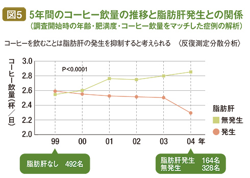 1999年から2004年にかけて、A群とB群のコーヒー飲量の推移を比較したところ、この5年間で脂肪肝になった人は「コーヒーを飲む量が減っている」ことがわかった。もちろん、正確を期すために、飲酒量や運動量などコーヒー以外のファクターを取り除く回帰分析も行なっている。