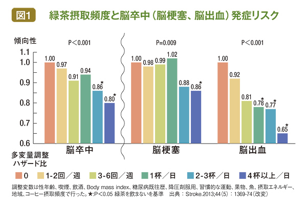 まずは緑茶だ。多目的コホート研究の開始時に緑茶を飲む頻度に対して質問した。その回答から緑茶を「飲まない」「週1~2回飲む」「週3~6回飲む」「毎日1杯飲む」「毎日2~3杯飲む」「毎日4杯以上飲む」という6グループに分けて、その後の脳卒中発症との関連を分析した。(図1)