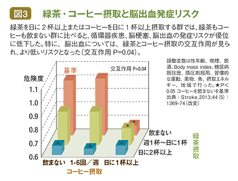 図3は、緑茶とコーヒーを飲んだときの脳出血発症のリスクをグラフ化したものだ。これを見ると、コーヒーを飲まなくても緑茶を飲めばリスクは下がるし、逆に緑茶を飲まなくてもコーヒーを飲めばリスクは下がる。さらに両方飲んでも同じように発症リスクは低下する。