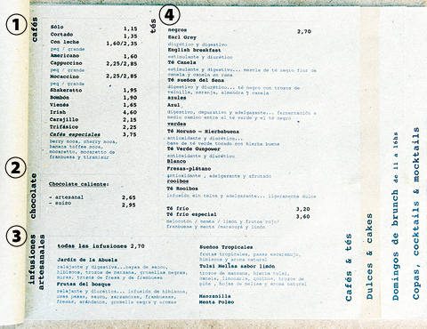 お茶:最近では、コーヒーだけでなく、お茶”Tés (テス)”のメニューが豊富なカフェも増えて来た。このように、紅茶”negro(ネグロ)”、緑茶”verde(ベルデ)”、白茶”blanco(ブランコ)”、などと分類されていることが多い。”Té rooibos(ルイボス・ティー)”も人気だ。