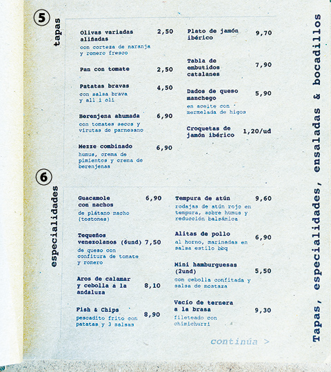 タパス:おつまみ。”Pan con tomate(パン・コン・トマテ)”は、スライスしたフランスパンにトマトをすりつけて、オリーブオイルと塩をかけるカタルーニャ地方では欠かせないメニュー。