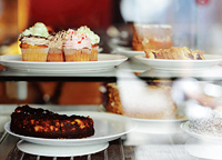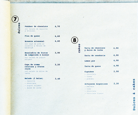 ケーキ:”Tarta de queso(タルタ・デ・ケソ)”はチーズケーキ、”Tarta de zanahoria(タルタ・デ・サナオリア/上写真下段)”は、ニンジンケーキだ。カップケーキ(上写真上段)は、近年バルセロナでも流行中。