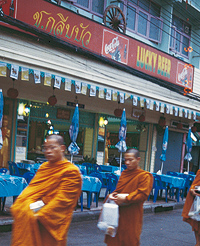 よく朝食を食べた店。店先で女主人が托鉢の僧侶の鉢に食べ物をいれ手を合わせていた。