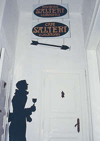 店の中にも影絵のグランドピアノが。中世ヨーロッパの雰囲気が残るプラハ旧市街地。
