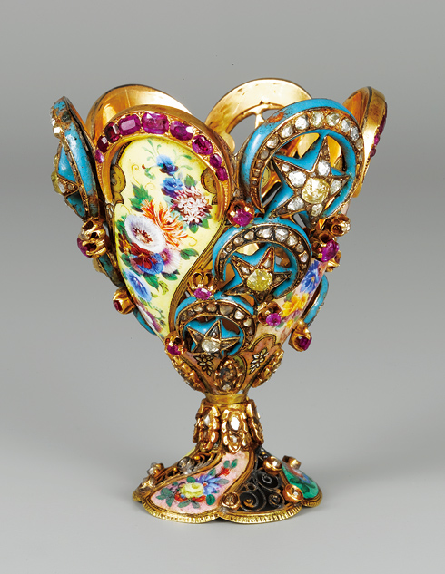 このコーヒーカップ受けは19世紀に作られた。高さ6㎝、径4㎝。多色の細かい花の文様をあしらったエナメル彩が鮮やか。オスマン朝では、短剣の鞘にも色とりどりの宝石がびっしりとあしらわれるなど、スルタンの持ち物には贅の極みともいえる豪奢なデザインが好まれた。