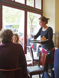 アナ・ブルーメのような人気のカフェでは、予約しているお客もいるので席が空いているように見えても勝手に座らず、ケルナーの案内を待つのがマナー。座りたい席があれば、「イスト・ヒア・フライ? Ist hier frei?(ここの席は、空いていますか?)」と尋ねて確認しよう。テーブル席とカウンター席の値段の違いはない。時間がない場合は、テイクアウトができるか聞いてみよう。「マッヘン・ジー・アウフ・カフェー・ツム・ミットネーメン? Machen Sie auch Kaffee zum Mitnehmen? (コーヒーのテイクアウトはできますか?)」。朝、テイクアウトのコーヒーを片手に出社するドイツ人は多い。ラッシュ時でなければ電車内で飲んでも特に問題はない。