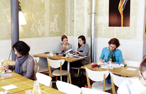 奥の席に座るアンナさん(左)とニナさんはドイツからの留学生。「ここはコーヒーが美味しいし、落ち着いて課題の相談ができるの」