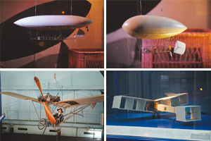 [右上]バラドゥーズ(散歩人)と呼ばれた9号機。 [左上] エッフェル塔の周りを飛んだ6号機。 [右下] 「世界初飛行」と報じられた14ビス号。 [左下] 軽飛行機ドゥモワゼル(トンボ)号。以上、すべてル・ブルジュ航空宇宙博物館で撮影。