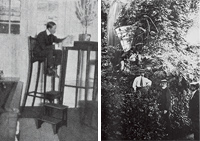 左:ゴンドラの上で食事をするための訓練にと特注された脚の長い椅子とテーブル。右:ロスチャイルド家の庭に墜落したときの様子。