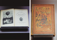 少年時代のサントス・デュモンに決定的なインスピレーションを与えたジュール・ベルヌの本。右は『地底旅行』の表紙、左は『気球に乗って五週間』の扉。
