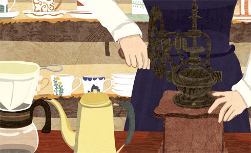 7つの連作短編で毎回解き明かされるのは日常の謎だ。殺人事件も起きないし、巨額の不正が明らかになったりもしない。緊迫感には欠けるが、本格ミステリーの重厚感とは対極の単純な推理の型に面白さがある。美星がコーヒー豆を挽くのに使っているのは、手回し式のコーヒーミル。木箱の上に球形のホッパーが載った、クラシックなモデルだ。毎回コリコリコリと豆を挽く音が、推理の始まった合図。最初に推理を披露するのは、アオヤマ。「全然違うと思います」ときっぱり言い切る美星。「その謎、たいへんよく挽けました」で謎解き完了だ。2人は、ある時は店で取り違いが起きた傘の謎に迫り、またある時は、大学生カップルの浮気疑惑に迫る。冷静な美星の姿は、アニメのヒロインのように型にはまっている。