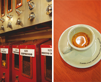 左:世界各国から仕入れたコーヒー豆各種がずらりとストックされている。右:エスプレッソは1.4ユーロ。良心的な価格も嬉しい。