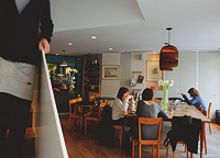 カフェは2階建て。1階には大きなガラス窓から地中海の太陽がいっぱいに入り、スタイリッシュなカフェ空間をさらに爽やかなものにしている。2階は一変して落ち着いた雰囲気の中、優しい光が差し込む。そして、屋上にもテーブル席を配置。路上テラスが主流だったバルセロナ市民を驚かせた。