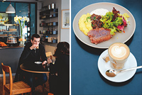 左:男性にもフラットホワイトは大人気だ。右:ステーキ(14.08ユーロ)とフラットホワイト(1.80ユーロ)のランチ。