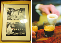 左:壁には歴代オーナーの写真が掛かっている。右:エスプレッソ(1.3ユーロ)は人気メニュー。バルセロナ風ガラスの器でひっきりなしに提供。