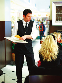 カウンターで立ってコーヒーを飲む人が多いのが、イタリアのバールの特徴だ。コーヒーのオーダーから支払いまですべてカウンターですませられる手軽さと、1杯の価格も安いことも人気の理由だろう(立って飲むと0.80~1.00ユーロ。座ると1.5~2.00ユーロ)。入店時に「座りたいですか?」と聞かれることも多い。座りたいときは「スィ Sì(はい)」と答えて案内してもらおう。座る場合はカメリエレにまずその意思を伝えよう。また、イタリアのバールは一日中軽食を出しているため、入店時に、「ブォーレ マンジャーレ Vuole mangiare?(お食事ですか?)」と聞かれることも多い。