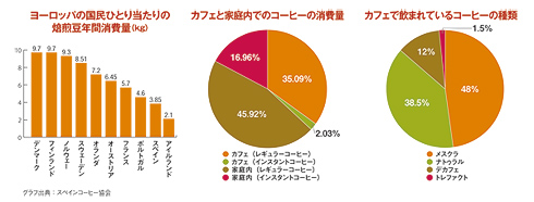 コーヒー輸入大国のスペインは、年間25万トンのコーヒー生豆を輸入し、その輸入量はヨーロッパで4位につける。これはコーヒー消費大国のフィンランドの輸入量を大きく上回る。しかし、焙煎豆の国民ひとり当たりの年間消費量では、一転して3.85kgと、紅茶が主流のアイルランドに次いでヨーロッパでの最下位を争っている。