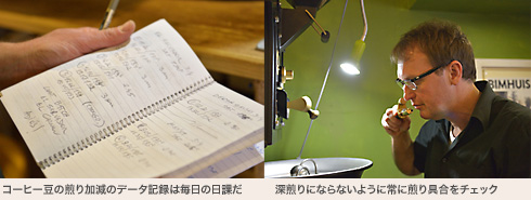 「この店をオープンした直後、近所にいくつかの大手チェーンのカフェが進出してきました。焙煎は、そんな彼らと差別化するために始めたんです。最初は手探りでしたが、毎日ノートに焙煎のデータを記録しながら研究するうちにお気に入りの煎り加減を見つけました。もちろん豆の原産地によっても微妙に変えますが、私は”2ハゼ”の前に火を止めます。浅く煎った豆を一体成型ガラスのコーヒーメーカーでゆっくりといれると、さっぱりとフレッシュなコーヒーになるんです」