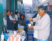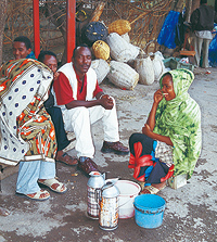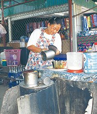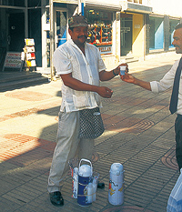 早朝の市場付近。作り置きのコーヒーは魔法瓶ではなく、写真手前の布で包んだ容器の中に。