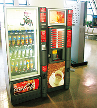 上海浦東国際空港のコーヒーの自動販売機。画面に流れていた映像は中国共産党の歴史だ。