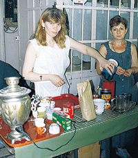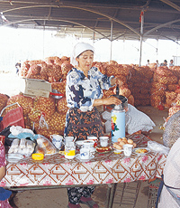 首都トビリシの市場。写真左端のロシア式湯沸かし器サモワールは美術工芸品のよう。