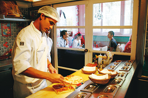 歴史ある本屋にサリーやカーディ(手紬、手織りの布)製のインド服のブティック……。昔ながらの店が軒を連ねる一方、洒落た雑貨店や輸入食材店などが続々とオープンし、デリーの「いま」が感じられるカーン・マーケット。その中で話題を集めるのが、人気セレクトショップの最上階にある「ラティテュード28」だ。カリスマ女性シェフ、リトゥ・ダルミアが手がけたこの店では、まだインドでは珍しいヘルシーなイタリア料理やとびきり美味しいコーヒーが味わえるとあって、一日中客足が途絶えることはない。