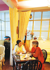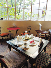 パステルカラーの壁にギャザーたっぷりの小花柄のカーテン、使い込まれた白いピアノ。イギリス統治時代のアンティーク・カップの数々……。古き良き時代のイギリスを彷彿とさせる店内では、女性客や若いカップルが楽しそうにおしゃべりに興じている。テーブルには、インドではまだ数少ないフレンチ・プレス式のコーヒーサーバーが提供されている。