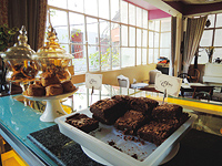 古き良き時代の英国をイメージしたシックなインテリアの中、フレンチ・プレス式のコーヒーが味わえる。ショーケースの上には焼きたてのパンやスイーツが並ぶ。ブラウニー(100ルピー)、スコーン(2個で150ルピー)。