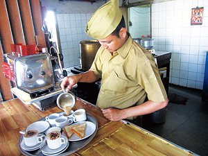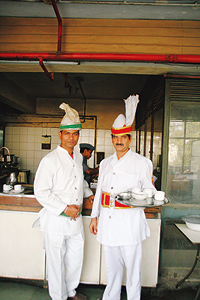 一歩店内に足を踏み入れると、そこに広がる情景はまるで古い映画の1シーンのよう。ベンチシートにどっしりと腰掛け、淡々とコーヒーを啜るターバン姿の老人。カーキの制服にネルー帽(初代首相のネルーが愛用した帽子)姿のバリスタ。極めつけはまばゆい白の制服に、赤や緑のカマーバンドを締め、ターバンを被ったスチュワード(給仕係)で、これは創業当時と変わらぬ衣装だという。