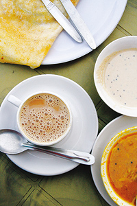 「モンスーン・マラバル・コーヒー」をご存知だろうか? 南インドのマラバル海岸沿いやカルナータカ州、ケラーラ州で産出される豆のことで、コーヒー生産量世界第7位を誇るインドにあって、ことに世界中のコーヒー愛好家たちの注目を集める逸品だ。魅惑の味が生まれるカギは、まさに「モンスーン(=季節風)」。インドの気候に多大な影響を与えるモンスーンは、6~9月の約4カ月間。この時期の雨量は作物の出来を左右するが、コーヒーも然り。雨に打たれて水分をたっぷり含むことにより、酸味が消えてpHバランスのよいマイルドな味わいに仕上るのだ。そんな南インド産アラビカ種やロブスタ種でいれた香り高きコーヒーはいつの時代も人々を魅了する。ムガール王朝時代に王宮で嗜好品として人気を集め、17世紀初めには宮廷人たちが集うカフェサロンが存在したという。