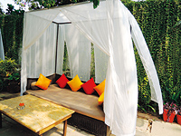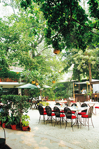 そんなインドならではの悠久の歴史に思いを馳せながらコーヒーブレイクを楽しめるのが、カフェレストランの「ローディ」だ。ムガール王朝以前の15世紀にデリーで隆盛を極めた「ローディ王朝」の王墓を中心とした遺跡公園隣に、格別な趣を持って佇んでいる。「ローディ」には2階建ての瀟洒な建物内のレストラン席と、広い庭に配されたおしゃれな天蓋付きの席とがあるが、もちろんおすすめは後者だ。