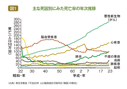 それからおよそ30年。いまだにがんはトップでありつづけている。2011年の死因別死亡数は、第1位ががんで死者は35万7135人にのぼる。第2位が心疾患で19万4761人、第3位が肺炎で12万4652人、第4位が脳血管疾患で12万3784人となっている。つまり、日本人の3.5人に1人ががんで亡くなっている計算だ。(図1)