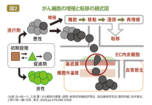周辺の組織や臓器に広がることを「浸潤」と呼び、離れた別の臓器に移ることを「転移」という。がん細胞がしみ出るように広がって(浸潤)、さらに体のあちこちの臓器に飛び火(転移)し、いたるところに新しいがんの巣をつくっていくのだ。(図2)