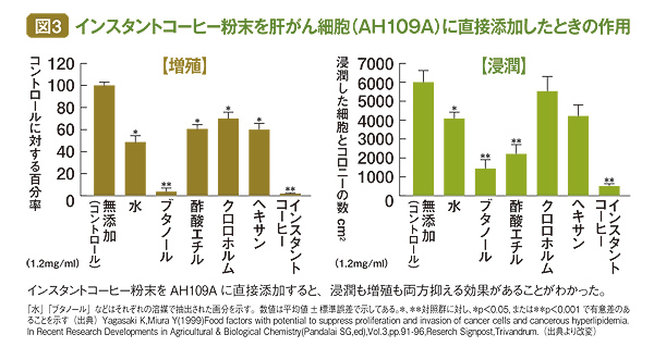 まず、インスタントコーヒー粉末をAH109Aに直接添加した。平たく言うと「ふりかけた」のだ。すると、AH109Aの浸潤も増殖も両方抑える効果があることがわかった。(図3)