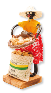 コーヒー農園の労働者を題材にしたかわいい人形。ボディーは銅線でできている。口が開いたコーヒーの麻袋からは本物の生豆がのぞいている。15レアル。