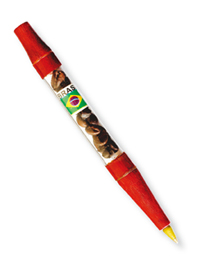 これぞ、ブラジル!コーヒー豆とブラジル国旗が詰められたボールペンは、ブラジルの土産店で見かける品だ。気軽な土産には使えるが、書き味はお確かめを。4レアル。