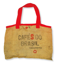ブラジル産コーヒー豆出荷用の麻袋を再利用したバッグ。持ち手は写真の朱色の他に、黒、緑、カーキ色、黄色の全₅色展開。縦49×横70(cm)、25レアル。