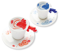 和の要素をポップに取り入れる日系食器デザイナー、ラケル・ホシノのカップ&ソーサー。シリーズ「インペリアル」は鉢の中で泳ぐ金魚を表現。赤:45レアル、青:36レアル。