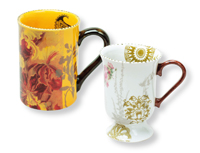 カルー・フォンテス作のマグカップ。さまざまな絵柄を重ねるのが特徴だ。2点ともに110レアル。