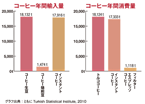 トルコでは、コーヒーは100パーセント輸入に頼っており、その量は年間に約37,521トン。そのうちのほぼ半分に当たる18,132トンはコーヒー生豆で輸入され、トルココーヒーとして消費される。