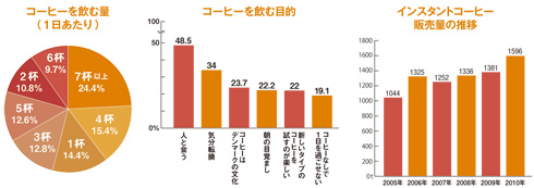 朝食の一杯から夕食後のコーヒーまで、長い間、平均的デンマーク人は濃い目のコーヒーを1日に何杯も飲んできたが、平均は1人当たり1日4杯ほどで、6杯以上も少なくない。国民約2000人に聞いたアンケートで、コーヒーを飲む目的を「人と会う」と答えるのが48パーセントほど。朝の「目覚まし」が22パーセントだから、圧倒的に多い。