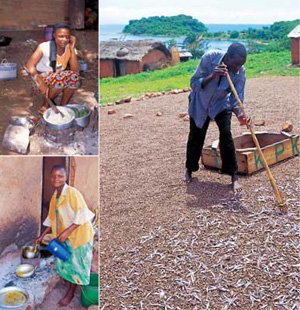 キゴマ近郊のカトンガで撮影。右:タンガニーカ湖に面した斜面いっぱいに、天日干しされた小魚ダガー。左上:主食のウガリを作る女性の耳元には、なんと携帯電話が当てられていた。左下:ダガーの天日干し現場に近い民家の調理場で、ダガー料理を作る少女。