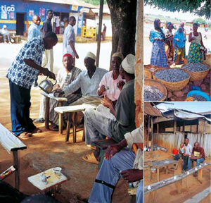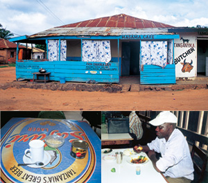 キゴマで撮影(上)トタン屋根の平屋建てのカフェ。(下右)主食のウガリにダガーをつけて食べる男。(下左)タンザニア産のインスタントコーヒー。