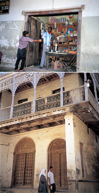 ザンジバルの中心ストーン・タウン(世界遺産)にて撮影。上:小さな食料品店の店先でコーヒーを売る。下:ヨーロッパとアラブ双方の影響を受けた町並みが見事だ。