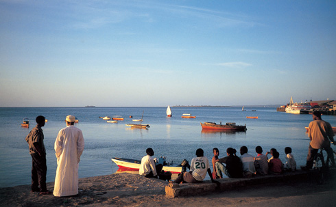 ストーン・タウンにて。サンゴ礁が美しいインド洋を望む。夕暮れ時、空は淡いピンク色に染まり人々が集う。