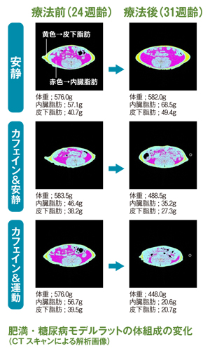 右の画像は、療法前の24週齢時と療法後の31週齢時に実験動物用のX線CT装置を用いた体組成の解析画像だ。安静にさせておいたOLETFラット(上)は体重も内臓脂肪も皮下脂肪も増えたが、カフェインを与えて運動させたOLETFラット(下)は激減した。体重22・2%減、内臓脂肪63・6%減、皮下脂肪47・5%減である。カフェインを与えて安静にさせておいたOLETFラット(中)も、体重16・3%減、内臓脂肪24%減、皮下脂肪28・5%減となった。これらは、カフェインによって代謝が進んだ結果だと鈴木教授は分析する。